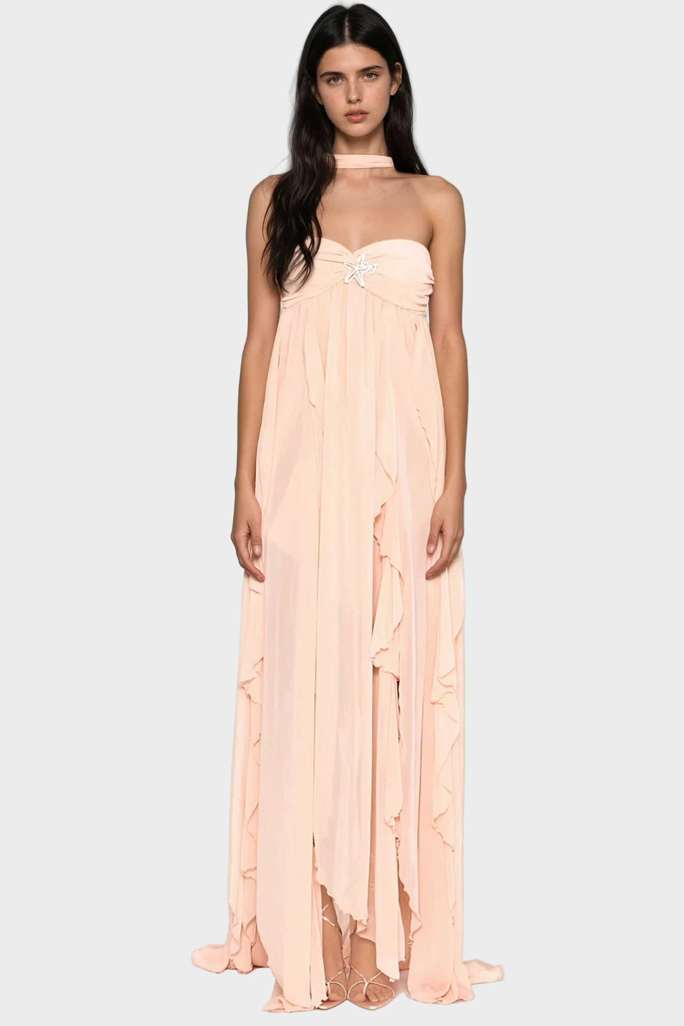 Lorena | Vestido Longo com Drapeado e Colar de Corrente