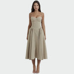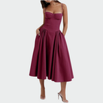 O corpete ajustado com alças finas realça a feminilidade, enquanto a saia fluida oferece conforto e movimento.